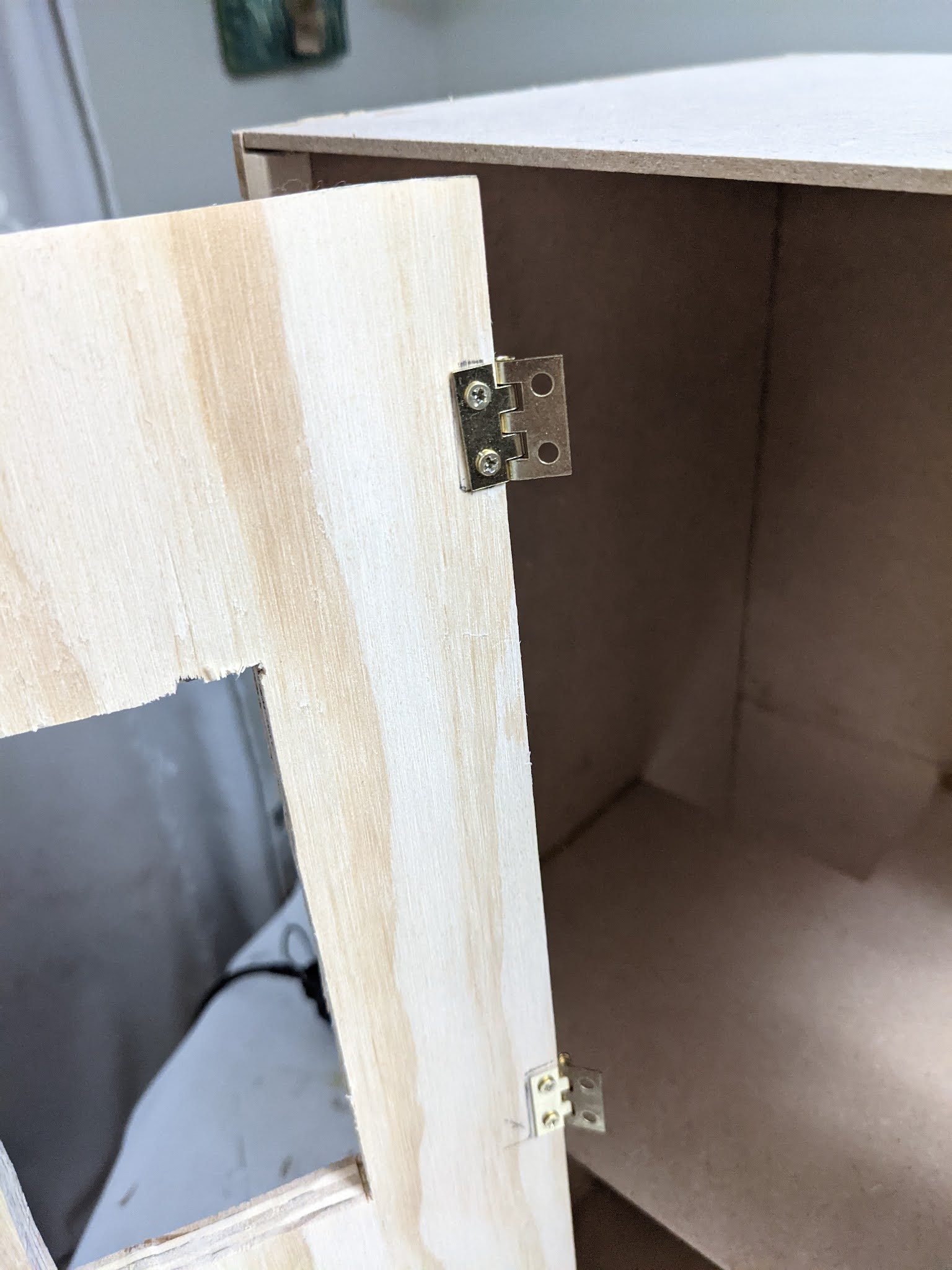 The front opening wall was cut from light weight plywood. I added hinges by first drilling small holes and then screwing on the hinges on the plywood then attached the hinges to the room box.