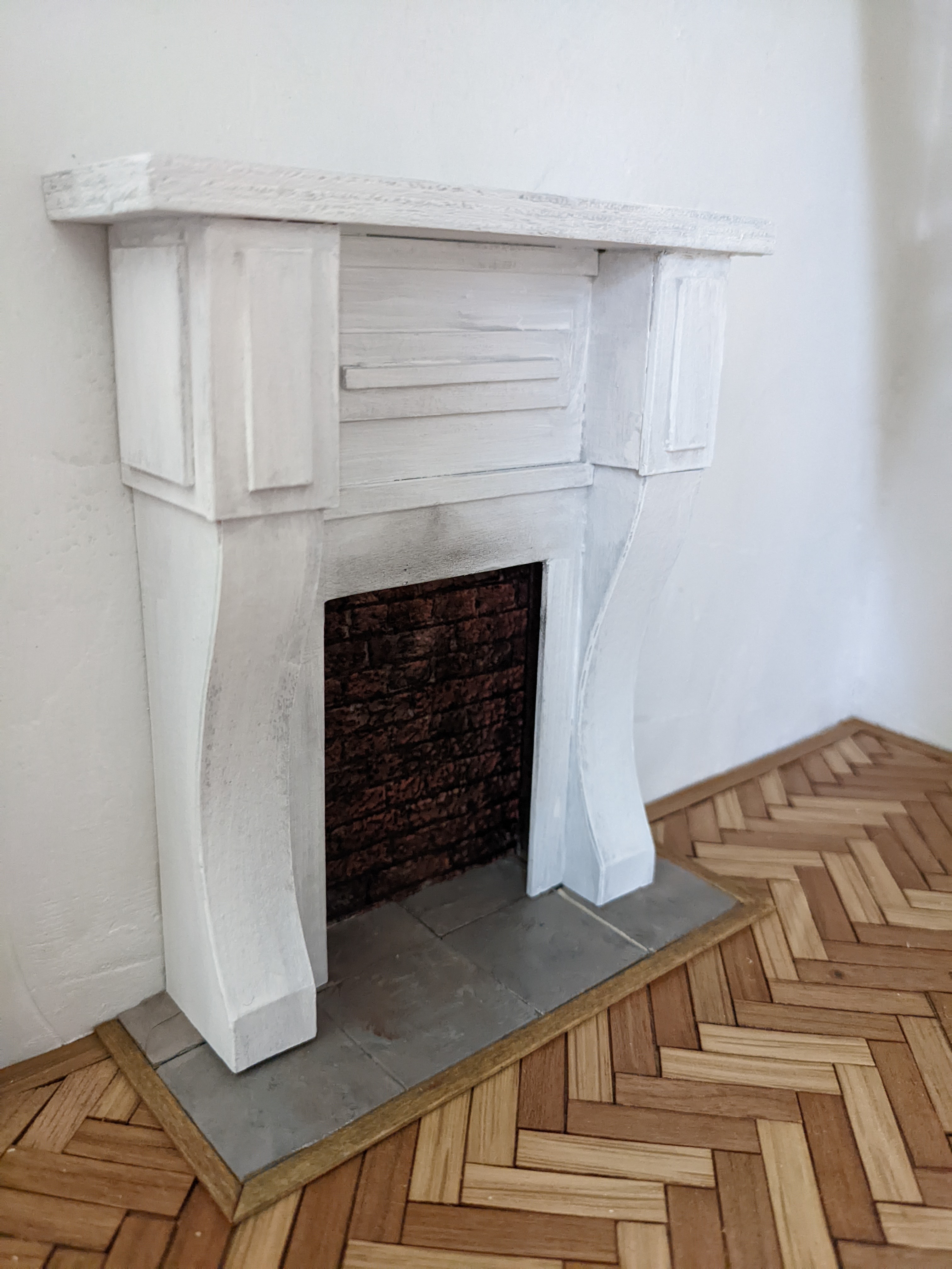 There is real wood flooring and the fireplaces were handmade. Windows and door open. Handmade paper poppies in the window boxes.